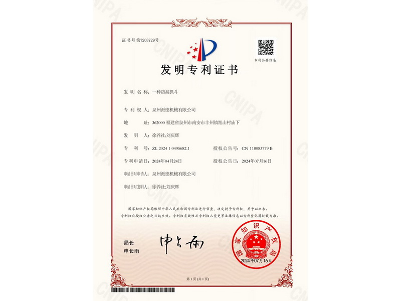 實用新型專利證書(一種防漏抓斗)